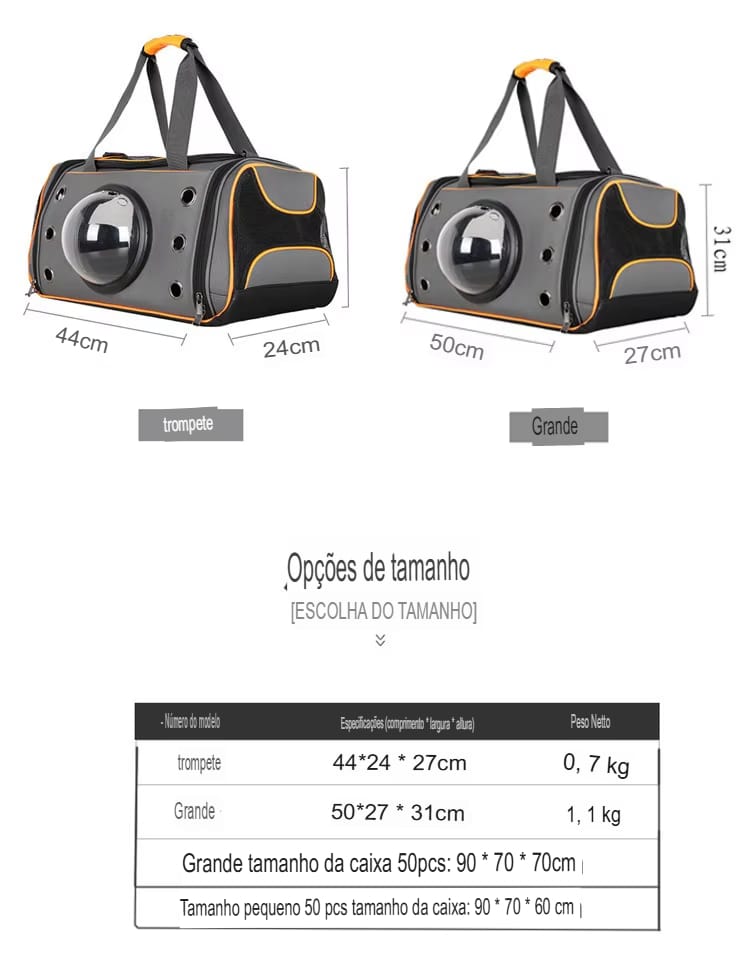 Outro ponto forte da nossa Bolsa Transporte Pet é sua capacidade generosa, comportando desde filhotes até raças de pequeno porte com facilidade. Torne seu dia a dia muito mais prático e estiloso enquanto mantém seu pet sempre ao seu lado!