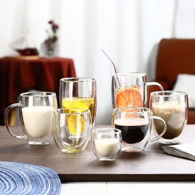 Caneca resistente e elegante de vidro borosilicato duplo ideal para bebidas quentes e frias. Disponível em vários tamanhos.