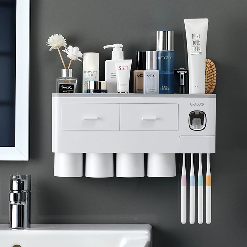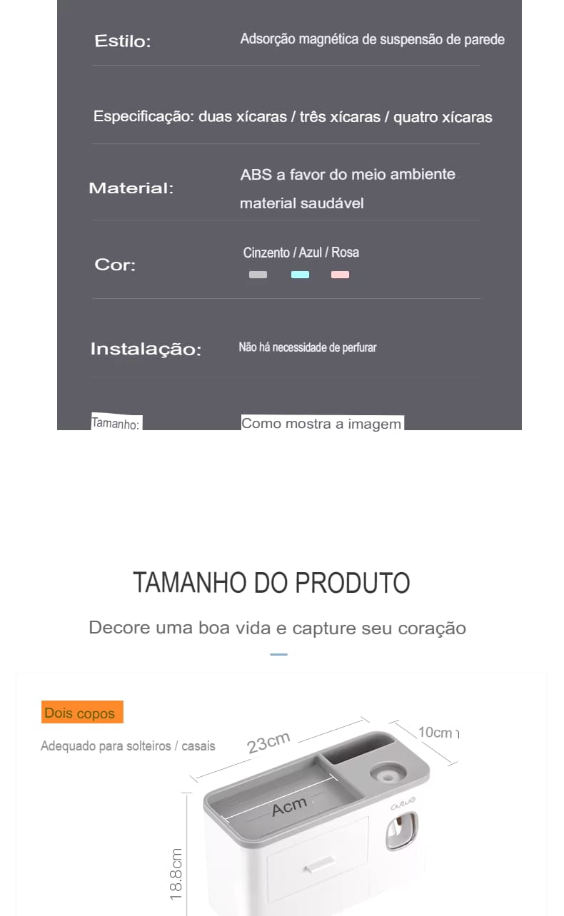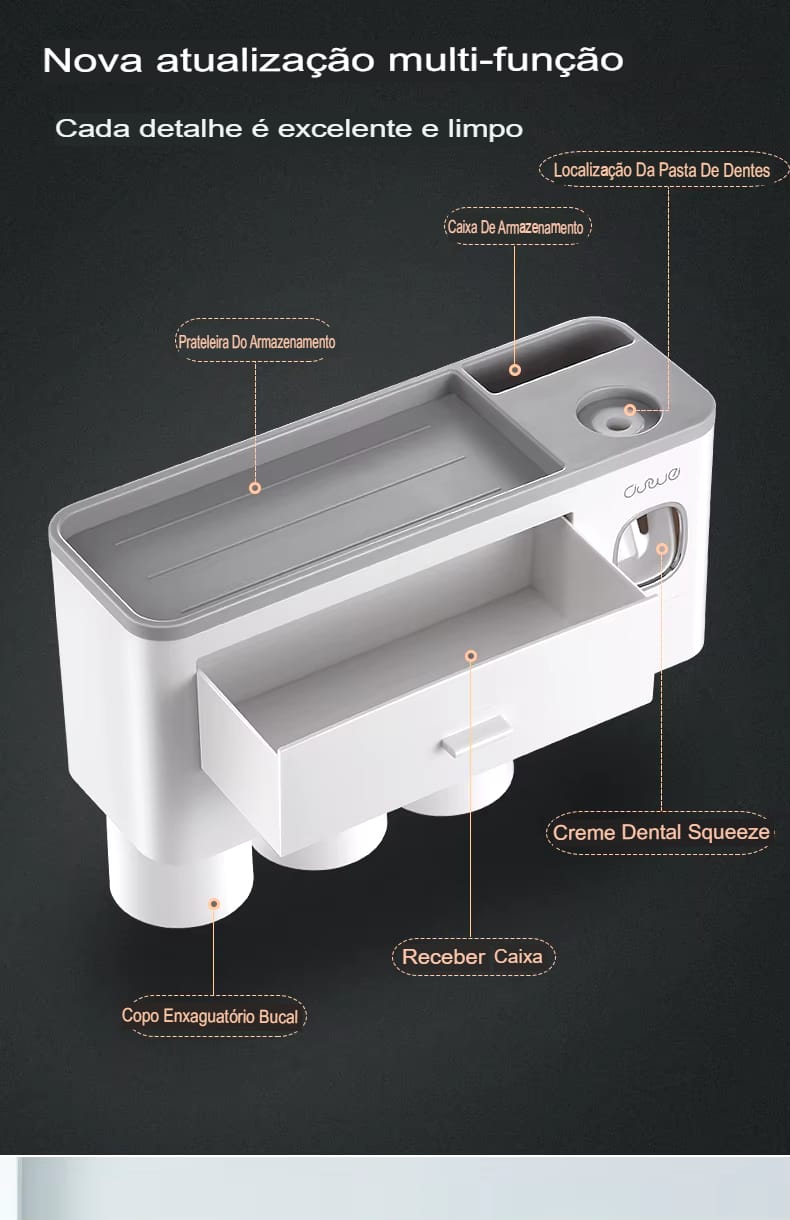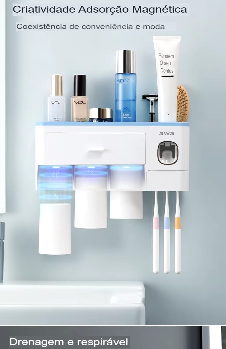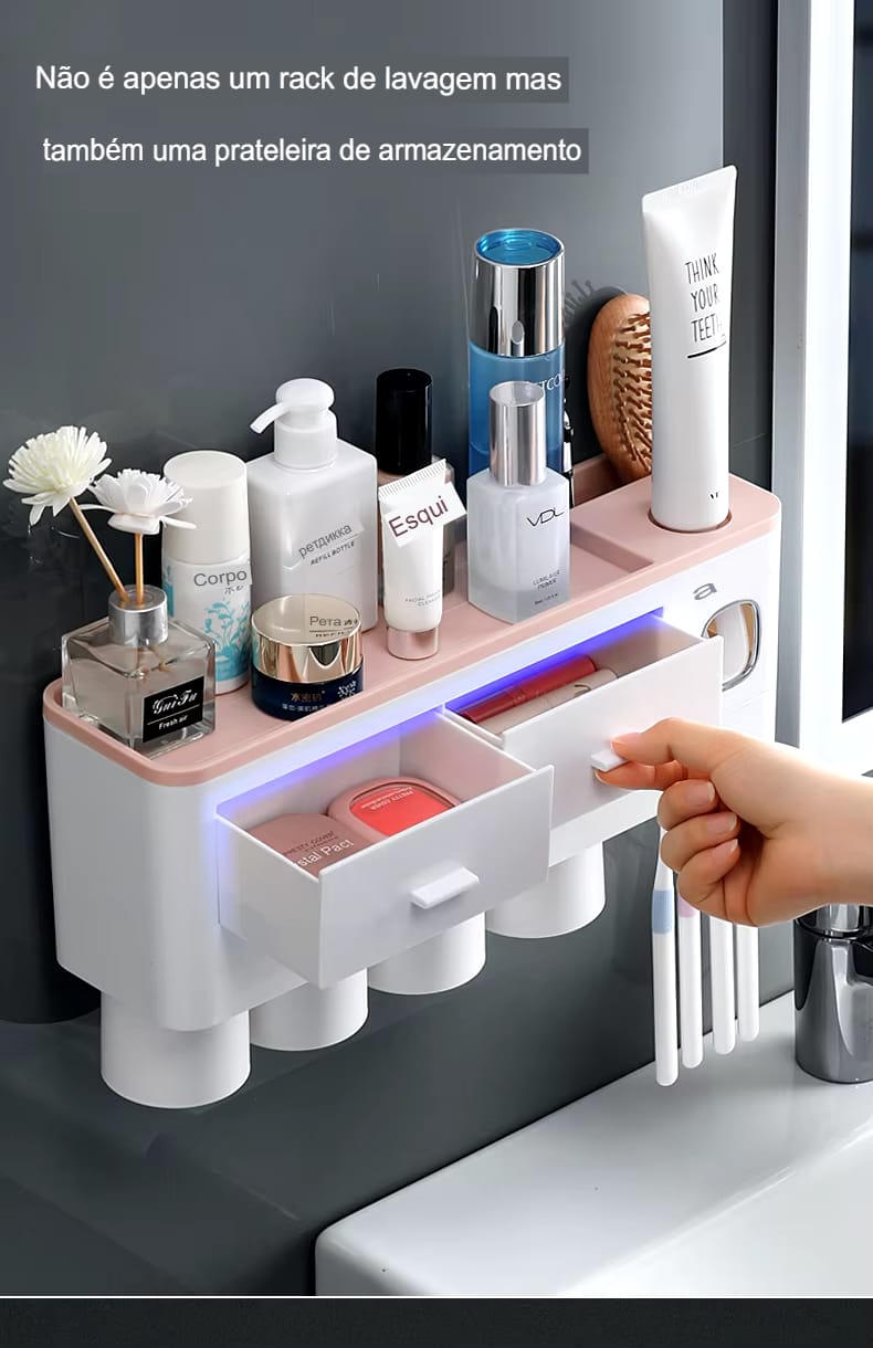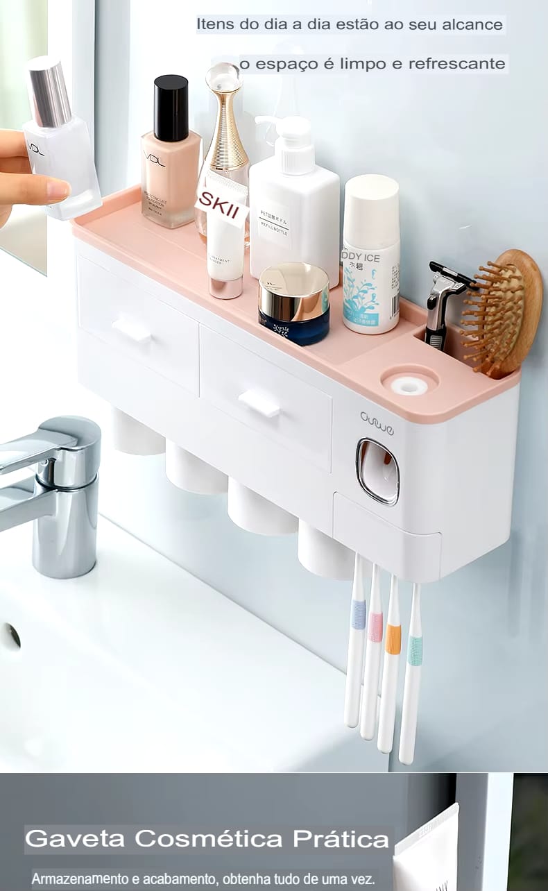 Transforme seu banheiro com praticidade! Organize escovas, dispense pasta automaticamente e ganhe espaço.
