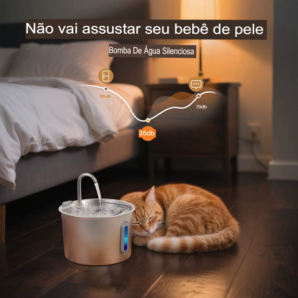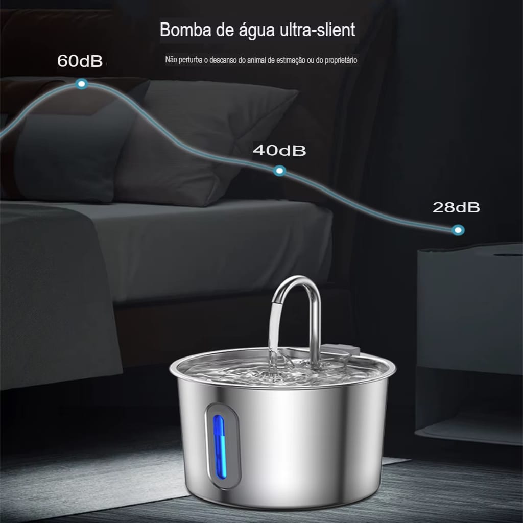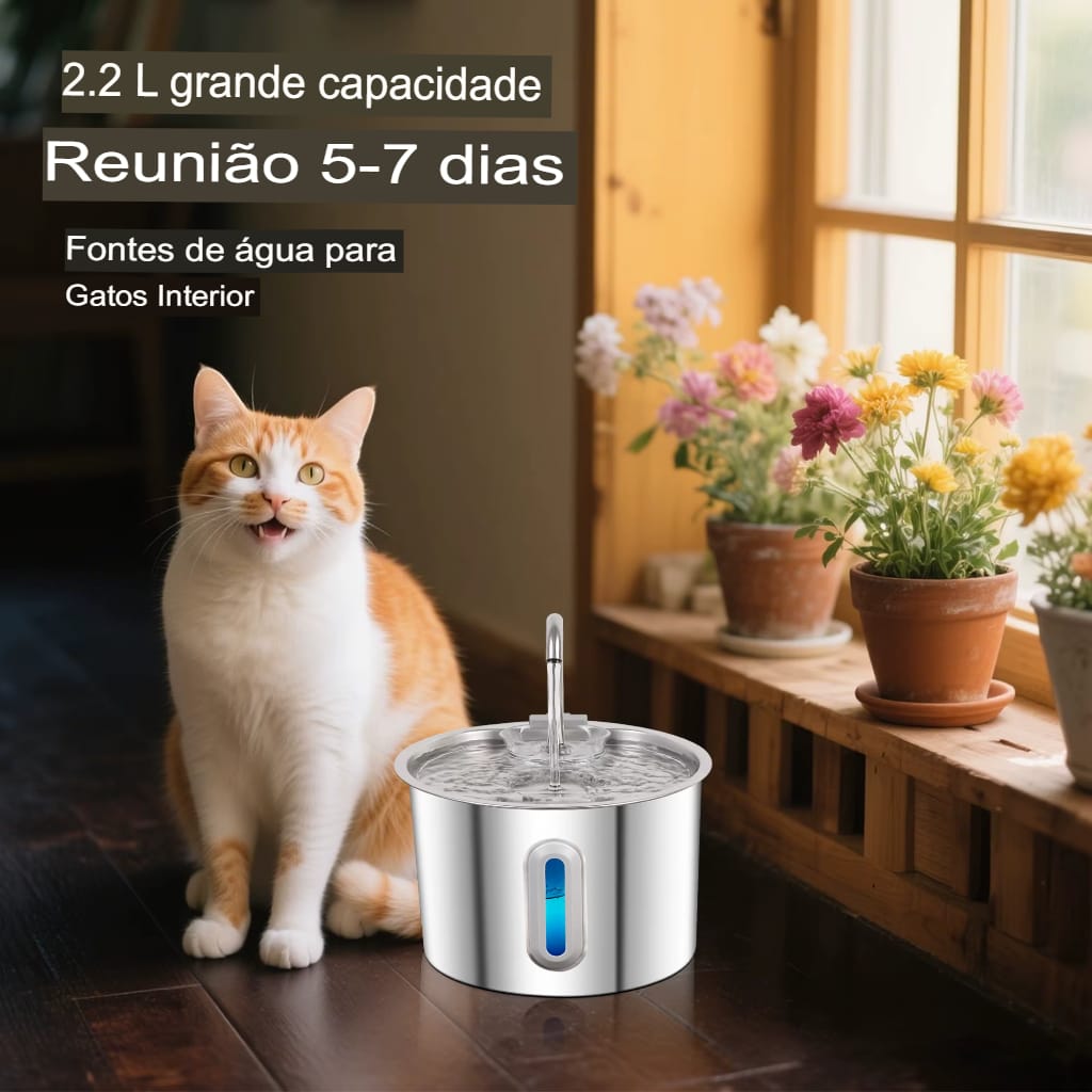 Fonte de Água Pet Inox 2.2L: Hidratação Silenciosa e Filtrada para Cães e Gatos