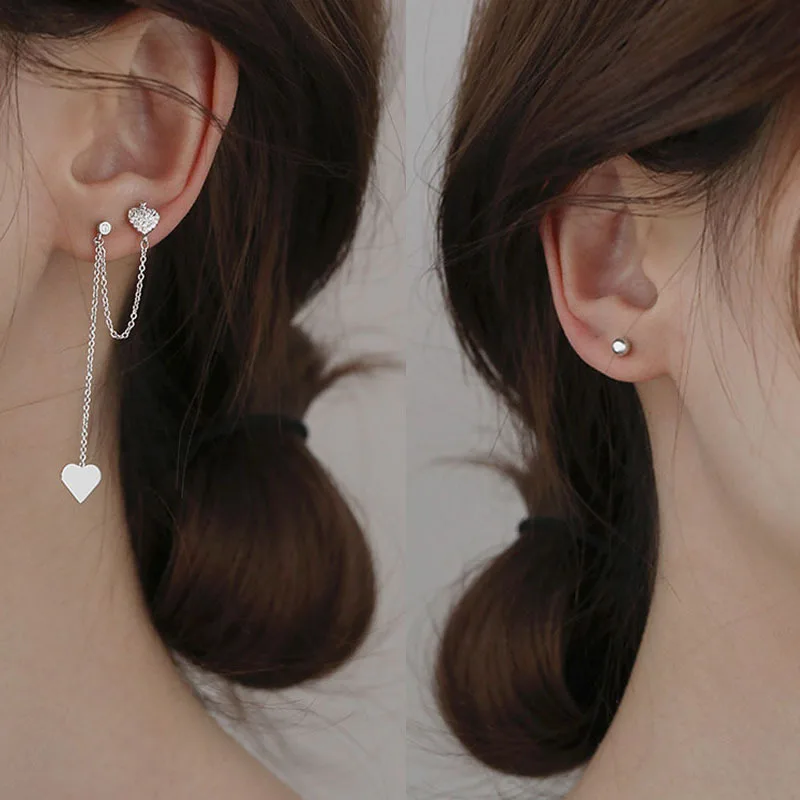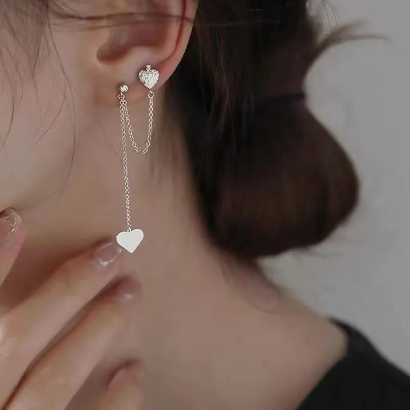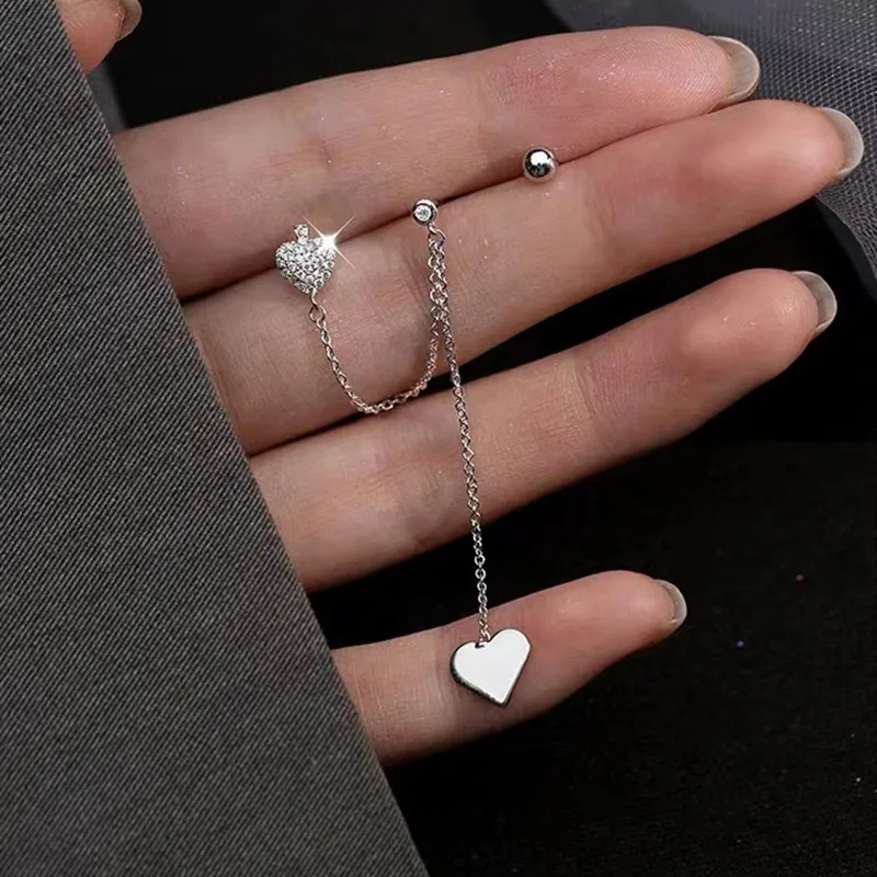 Brincos Assimétricos de Prata com Coração Duplo e Borla Elegante