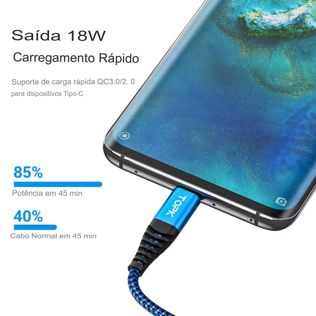 Cabo USB-C TOPK de 1m e 2m, carregamento rápido 3A. Durável, resistente e compatível com Samsung Galaxy.