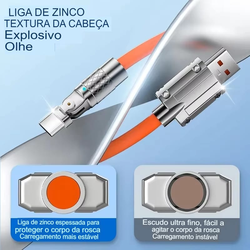 Cabo USB-C rotativo 180°, ideal para gamers. Oferece carregamento rápido de até 120W.