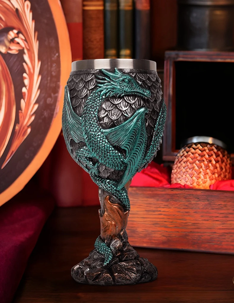 Caneca medieval com design 3D de dragão em resina e interior inoxidável. Ideal para fãs da cultura viking.