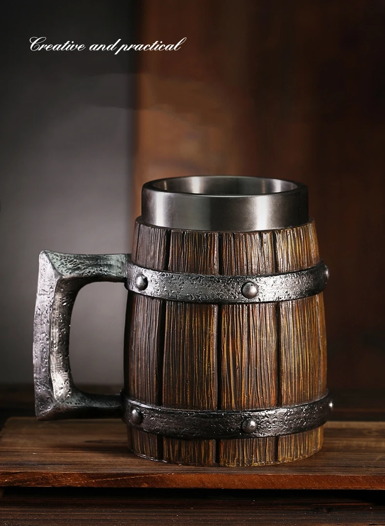 Caneca estilo madeira com isolamento térmico: mantém bebidas na temperatura ideal, design viking sofisticado.