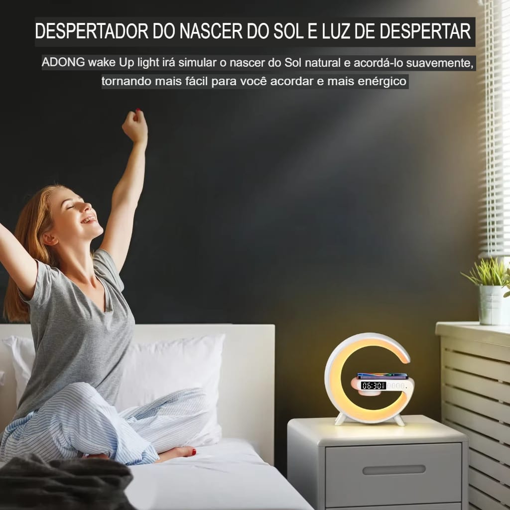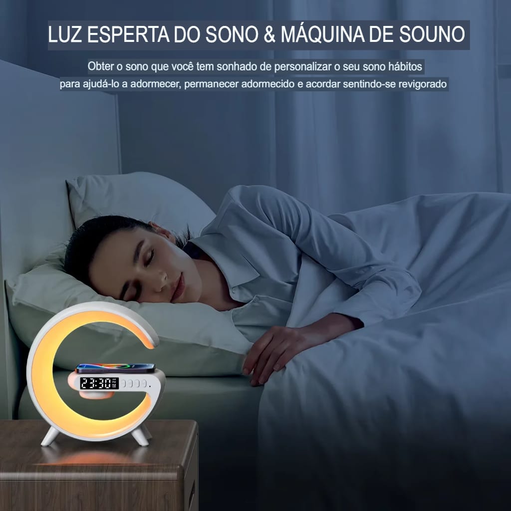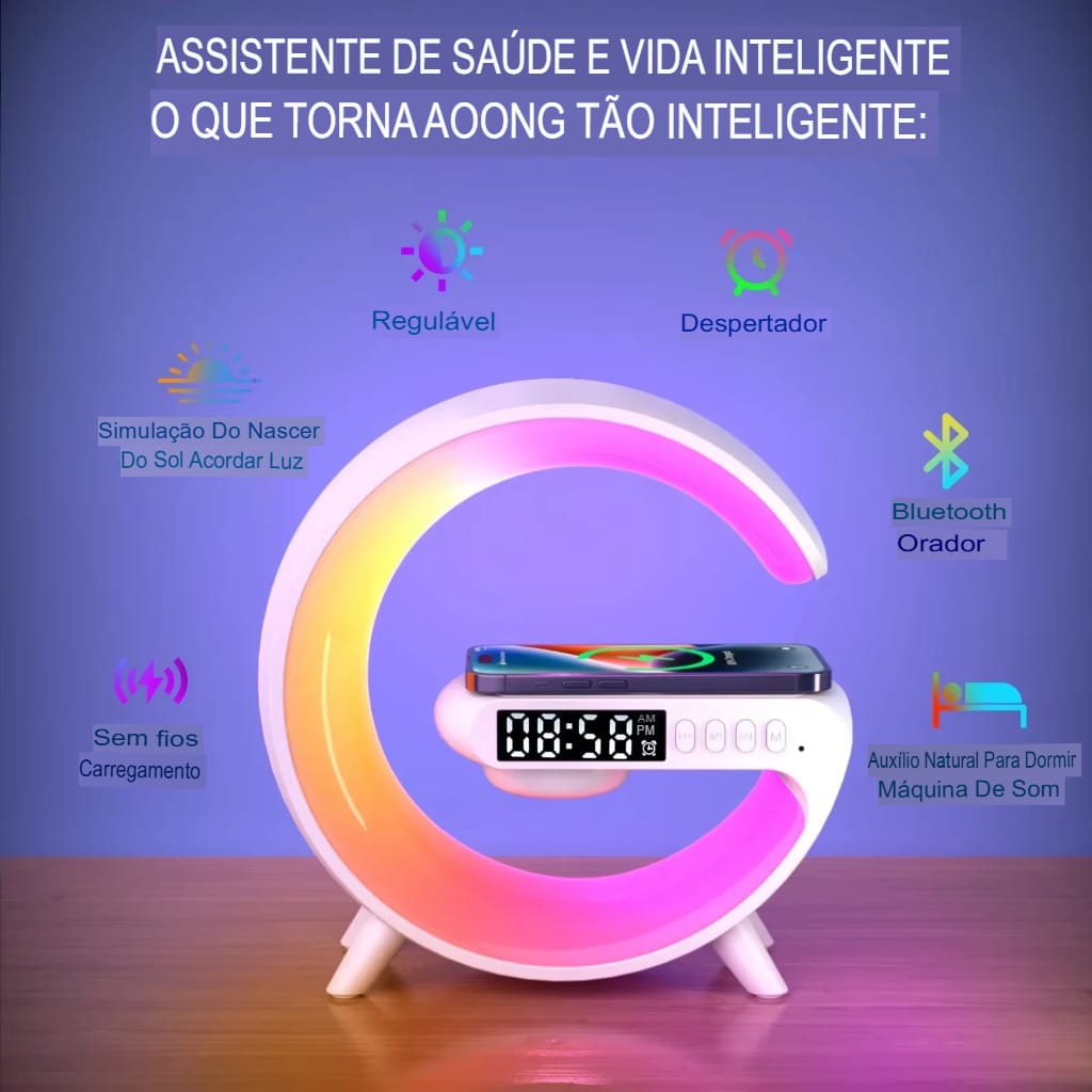 Carregador sem fio multifuncional: recarga rápida, suporte prático, luz RGB e alto-falante Bluetooth.