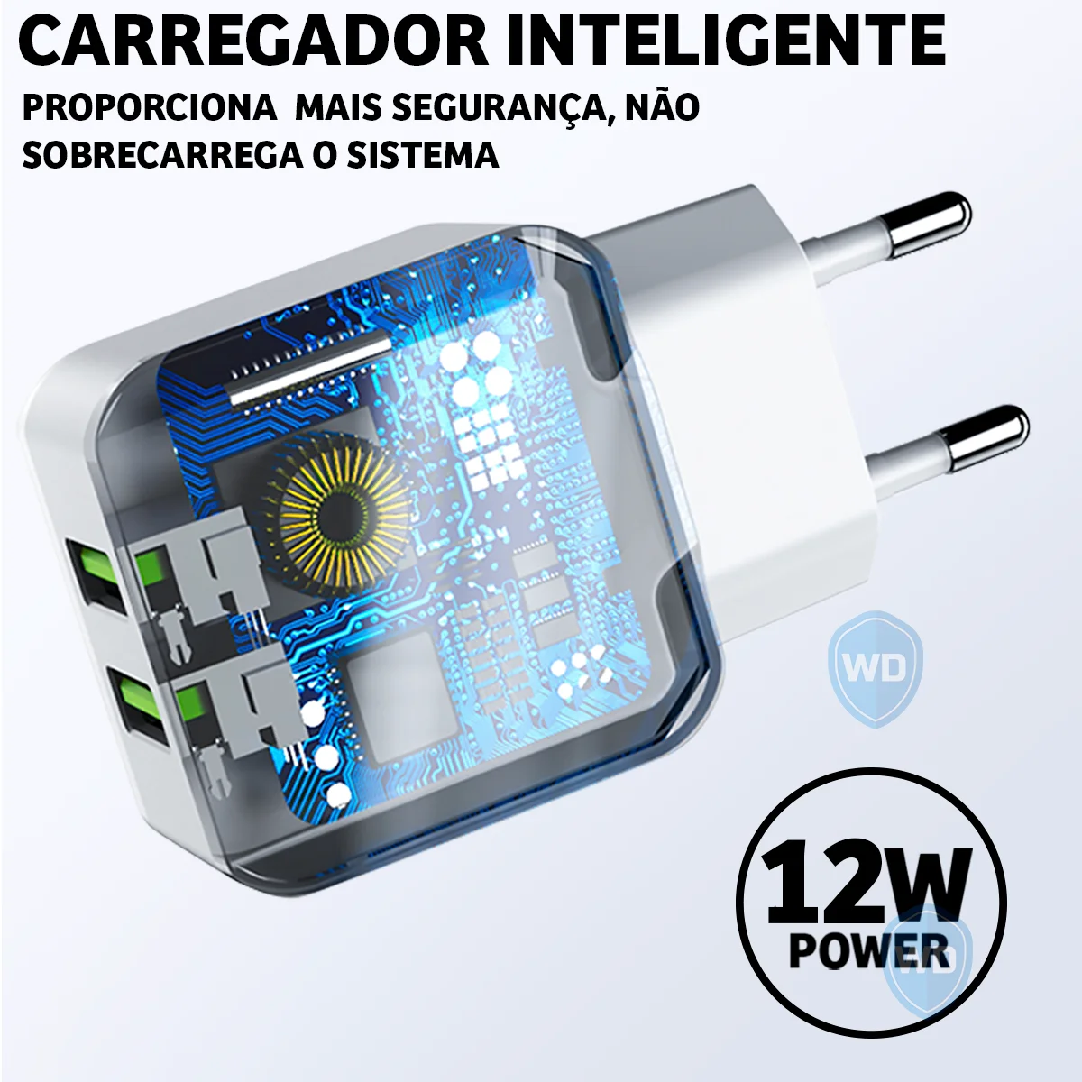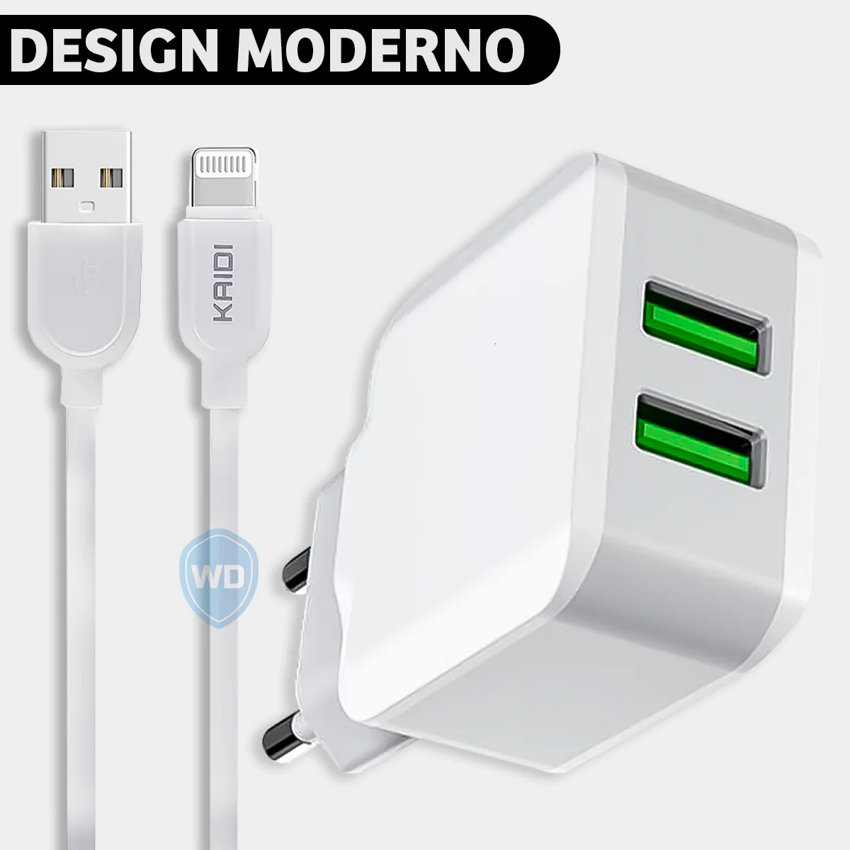 O Carregador Turbo Kaidi carrega dois dispositivos simultâneos com segurança e praticidade, ideal pra quem vive em movimento.