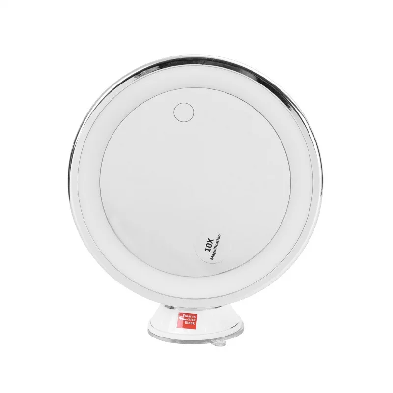 Espelho extensível com ventosa, ideal para maquiagem precisa com ampliação 10X. Facilita ajustes sem furo.