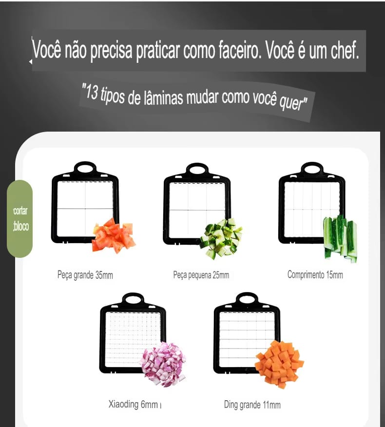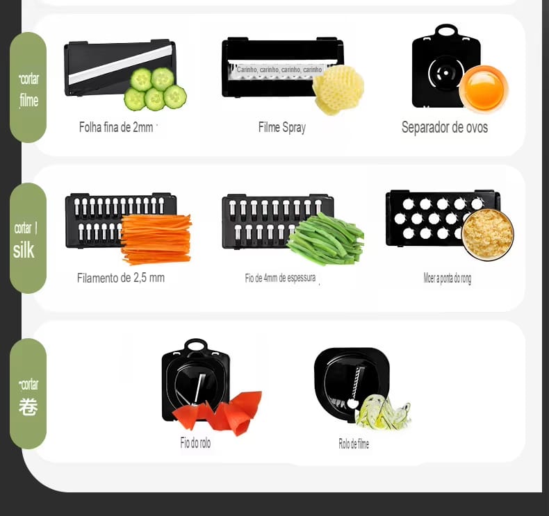 Esse fatiador é indispensável para quem busca praticidade. Ele permite cortar, fatiar e até fazer julienne de seus vegetais e frutas favoritos com facilidade. É ideal tanto para cozinheiros iniciantes quanto experientes, facilitando o preparo de saladas frescas, acompanhamentos coloridos ou até acompanhamentos sofisticados em minutos.