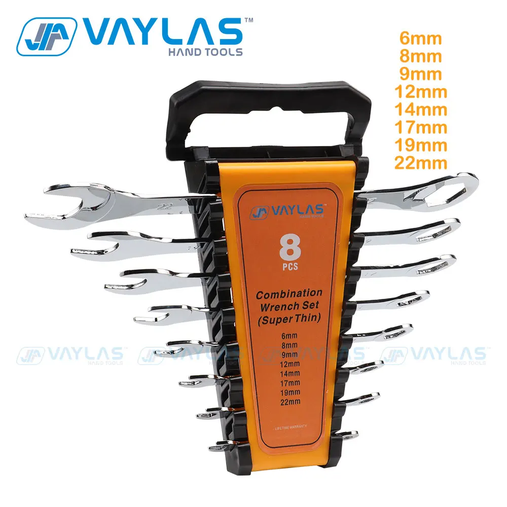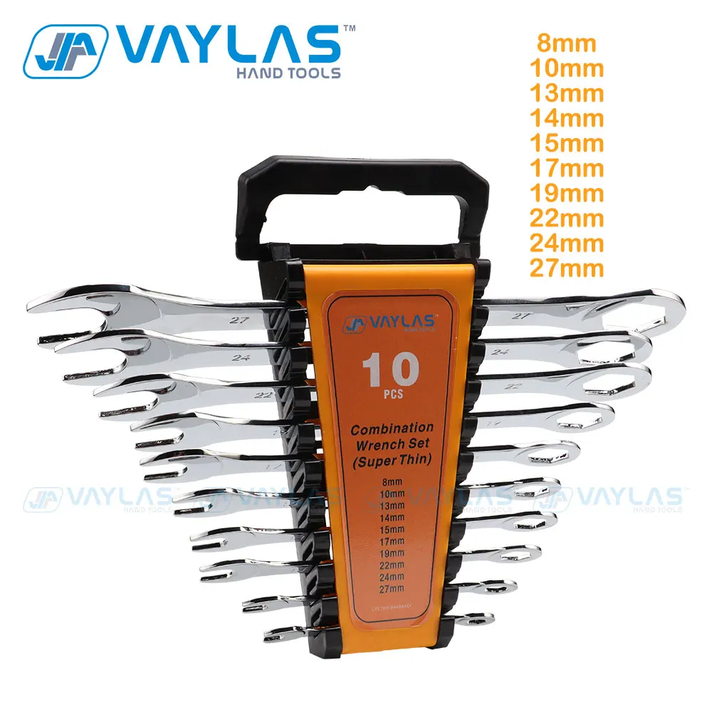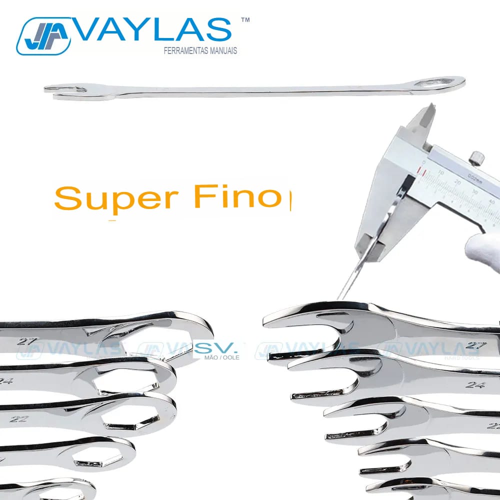 Conjunto de chaves combinadas superfinas (6-27mm), ideal para reparos precisos. Durabilidade garantida com aço cromo-vanádio e design ultra-fino.