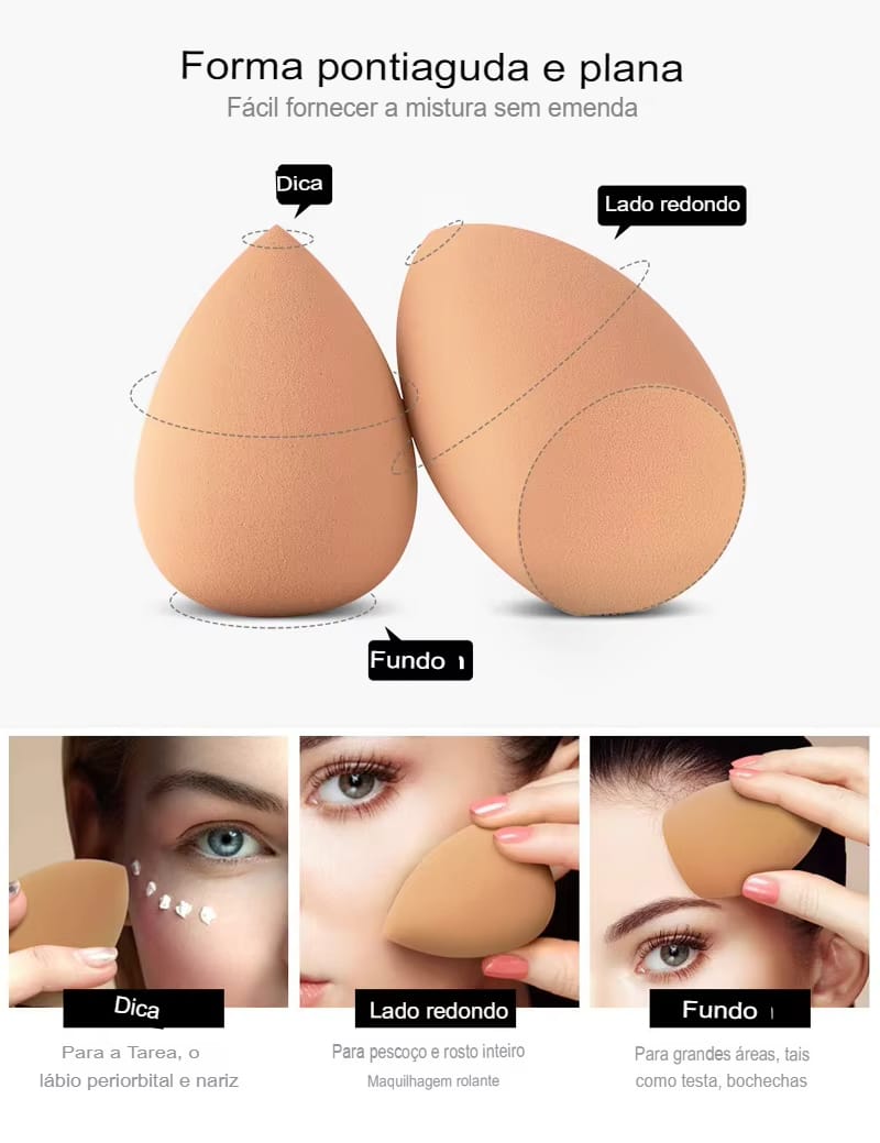 Essas esponjas são práticas e versáteis, proporcionando uma aplicação mais suave e homogênea dos produtos. Com seu design ergonômico, cada esponja permite alcançar todas as áreas do rosto, desde a testa até os cantinhos mais difíceis, garantindo uma maquiagem impecável.