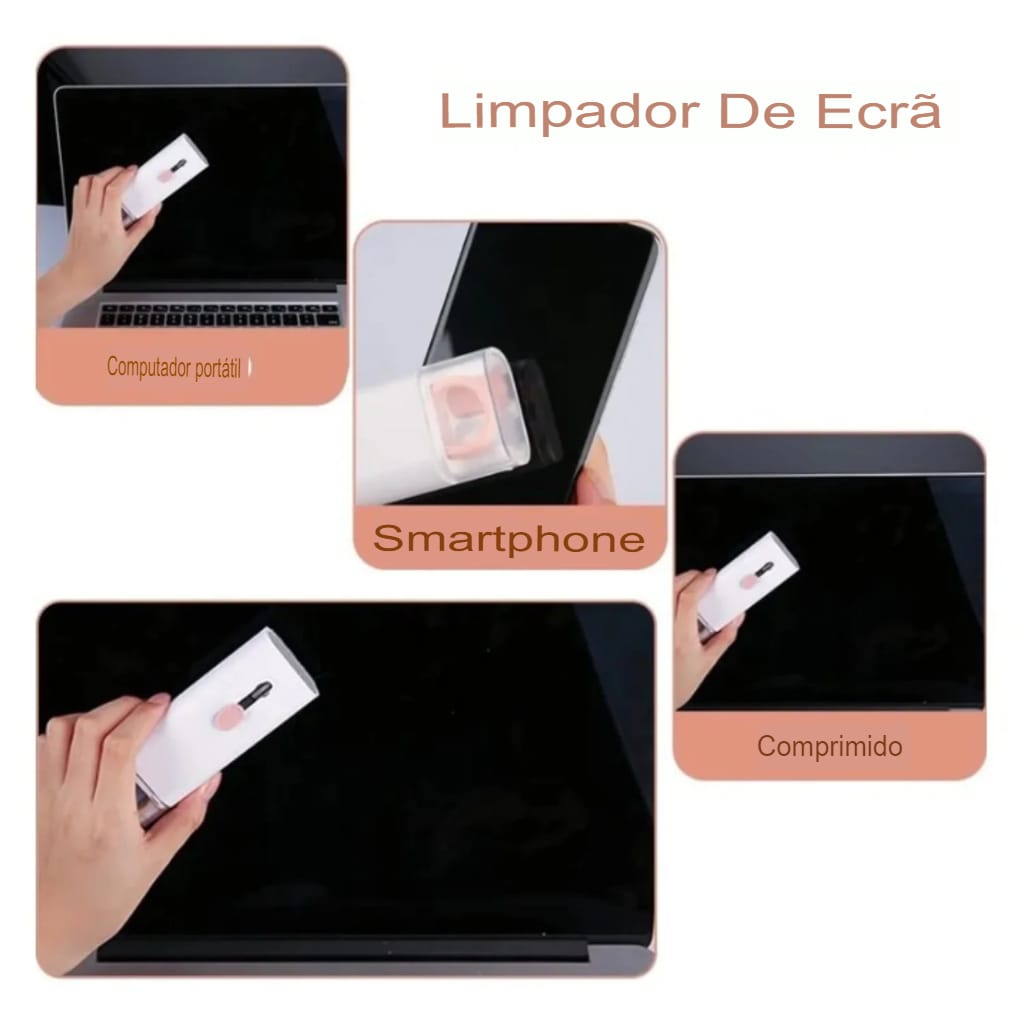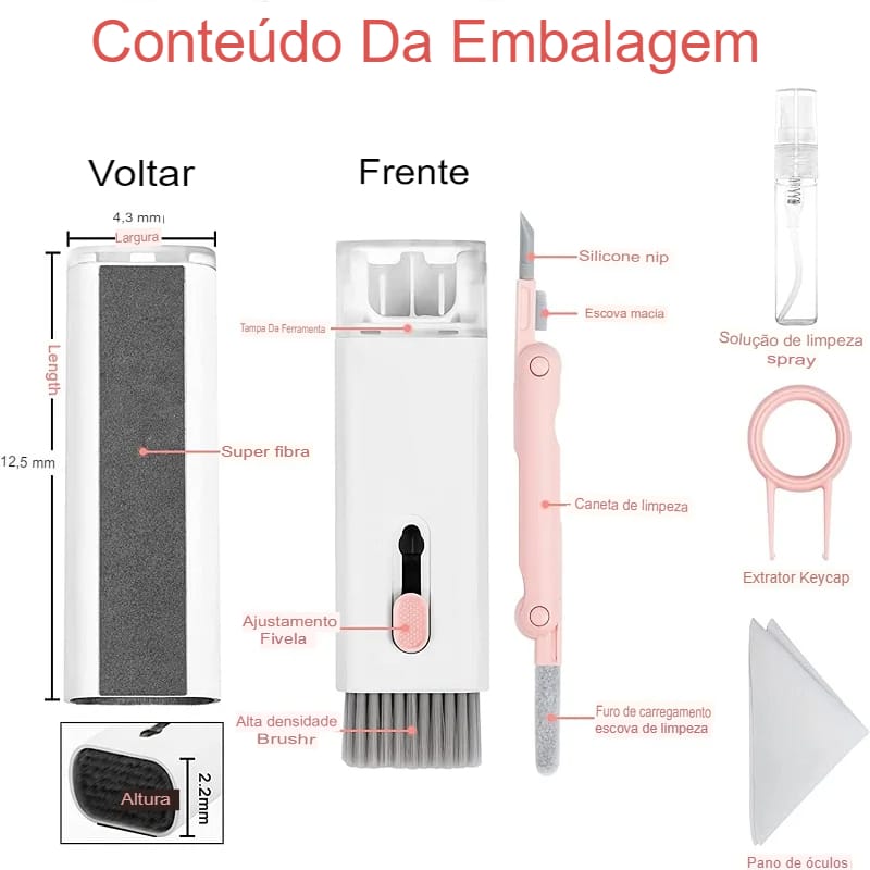 Mantenha seus gadgets impecáveis com o Kit de Limpeza Multiuso 7 em 1. Portátil e eficiente!