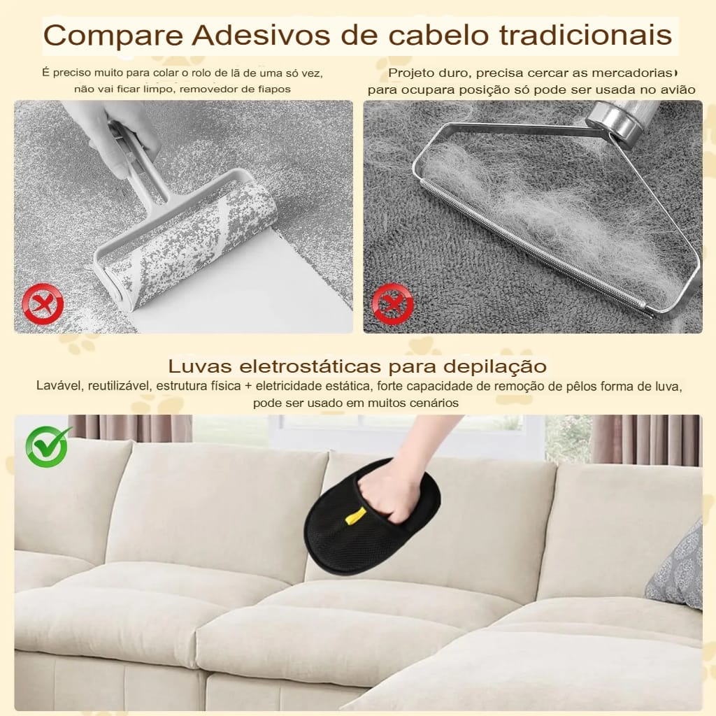 Luvas versáteis e eficazes que removem pelos de pets, limpando roupas, móveis e outros itens.