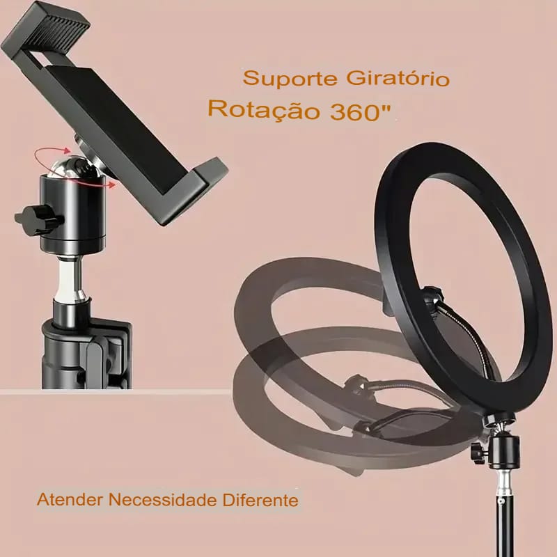 Luz LED Anel regulável e portátil com tripé para fotos e vídeos profissionais.
