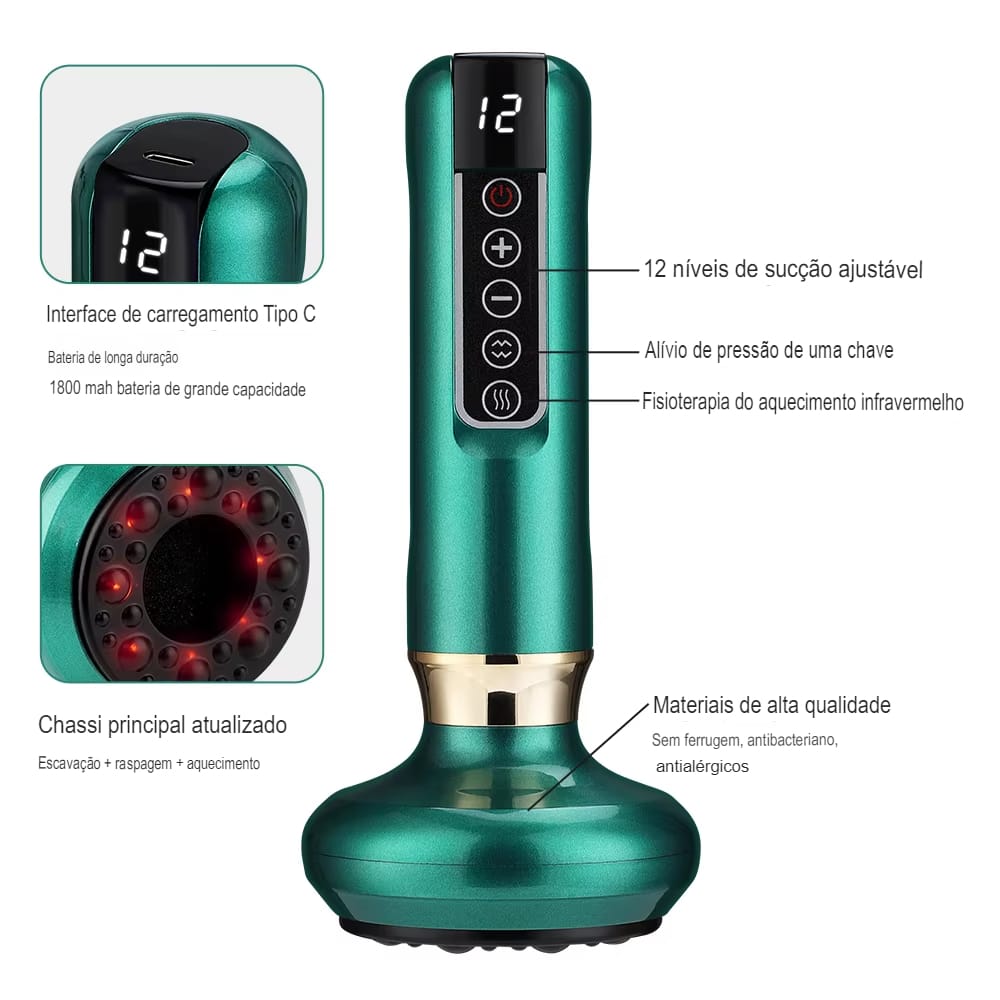 Massajador elétrico combina ventosas e GuaSha. Relaxa músculos, combate celulite com calor infravermelho.