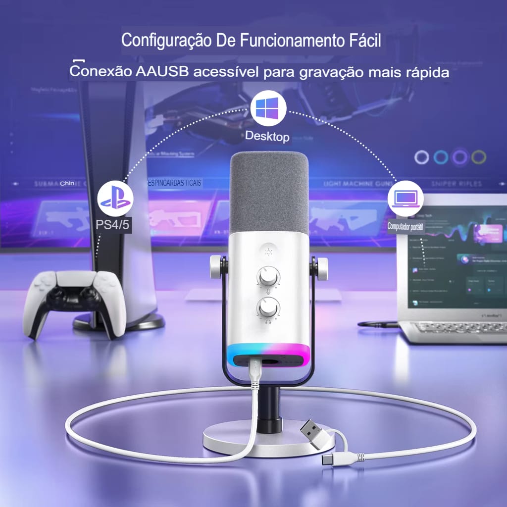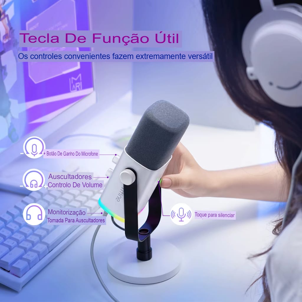 Equipado com faixa de frequência de 50 Hz-16 kHz e padrão cardióide, o AM8W garante um som claro e balanceado. As teclas de função facilitam o controle do microfone e do volume, enquanto a iluminação RGB personalizável adiciona um toque especial ao seu setup.