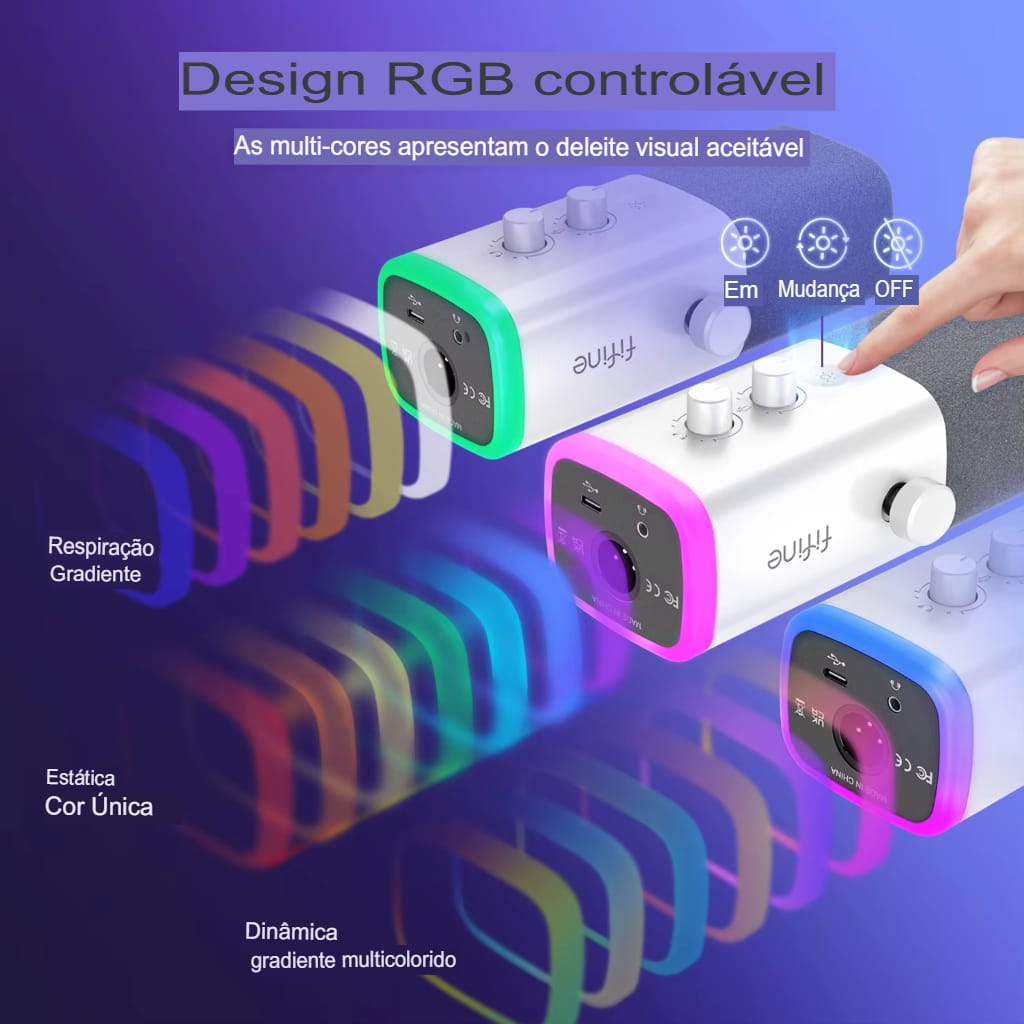 Microfone FIFINE AM8W com XLR/USB, RGB e mudo. Ideal para gravações e streaming com redução de ruído e monitoramento em tempo real.