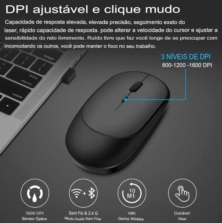 Este mouse possui duas modalidades de conexão: via Bluetooth, perfeito para dispositivos móveis como tablets e smartphones, e através de um receptor USB, ideal para computadores e notebooks. Esse recurso permite uma compatibilidade excepcional com uma vasta gama de aparelhos. Além disso, o mouse apresenta três níveis de DPI ajustáveis (800/1200/1600), adequando-se perfeitamente às suas necessidades em diferentes cenários.