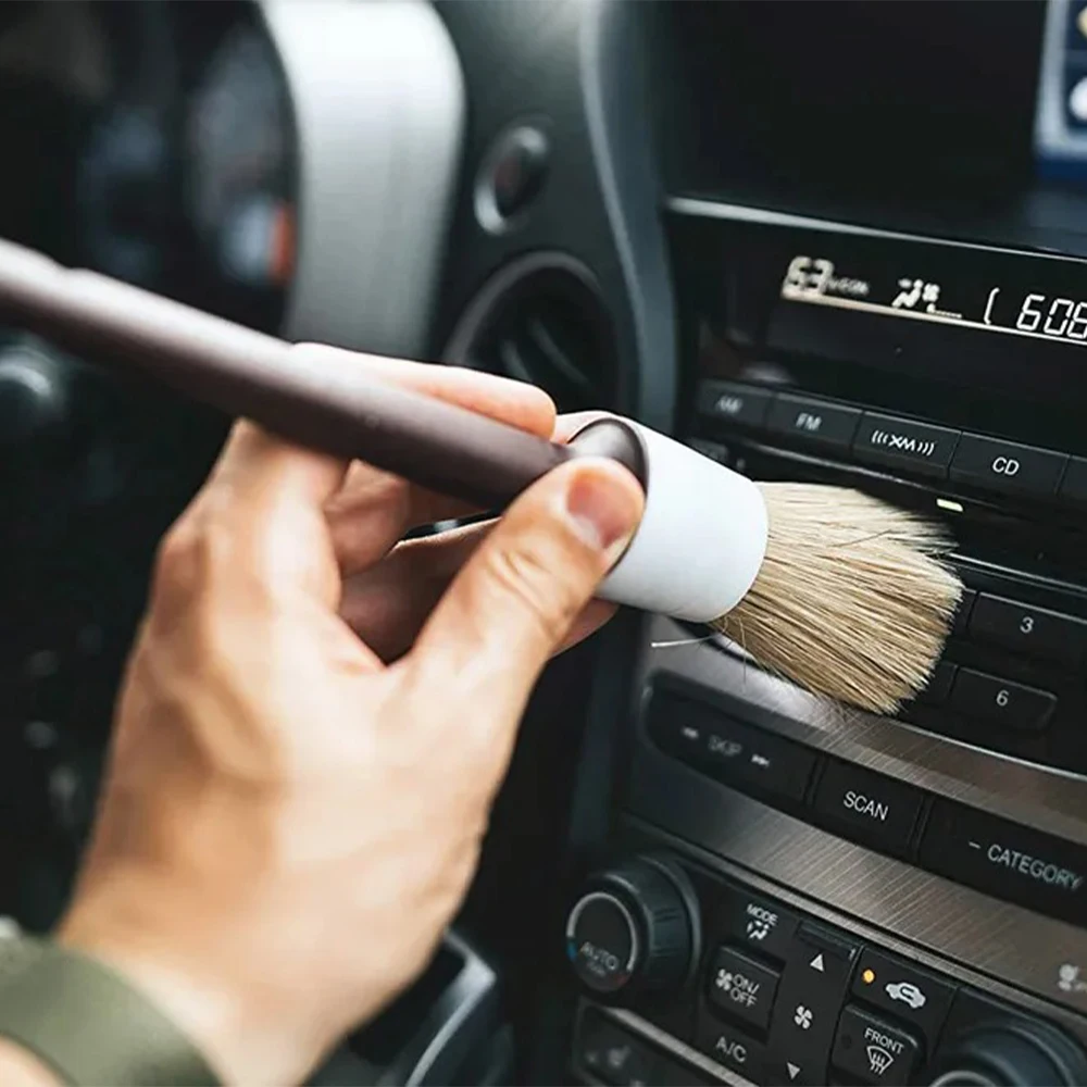 Pincel Detalhador multifuncional com cerdas macias de javali para limpar interiores de veículos com praticidade.
