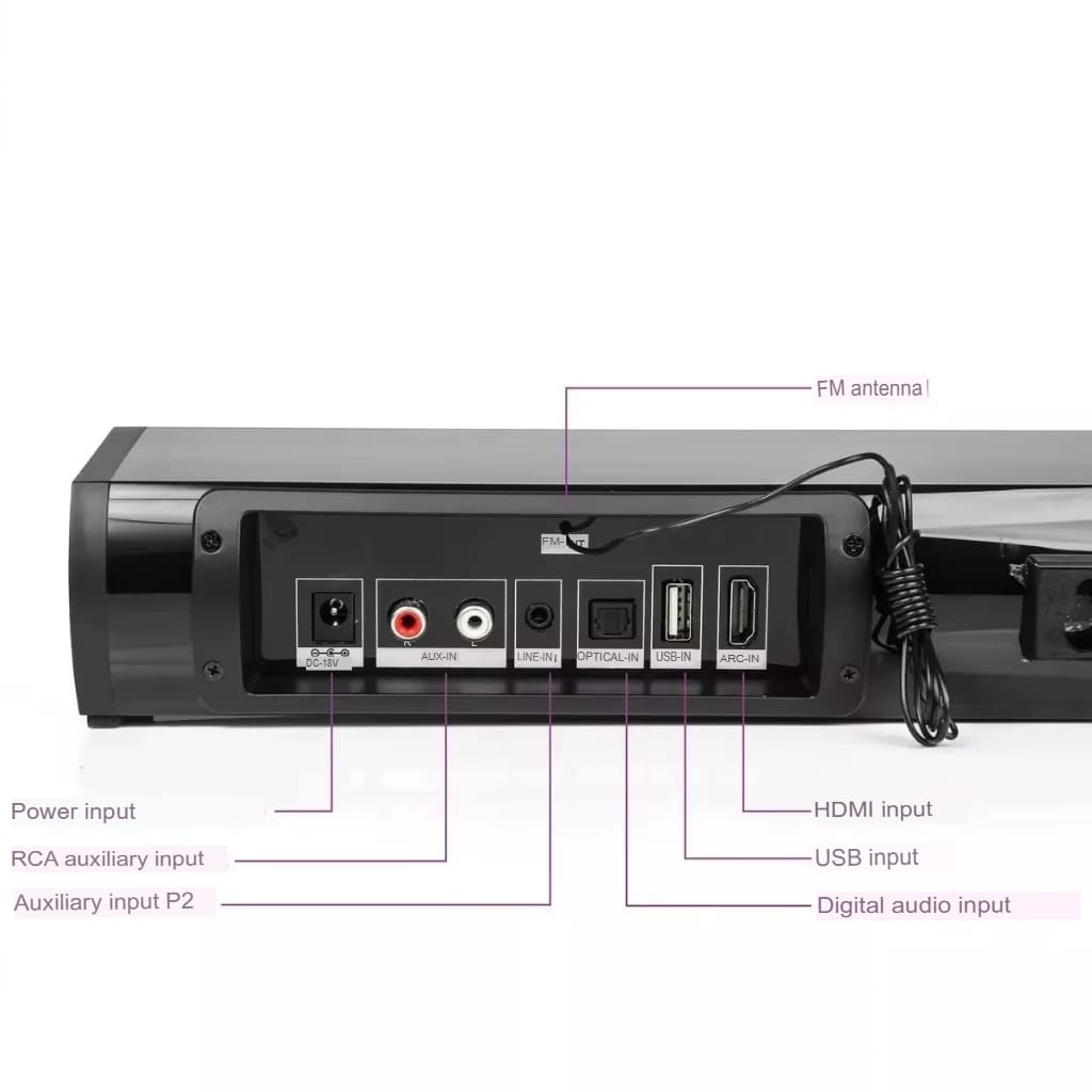 Desfrute de um som potente e imersivo com 20W de pura qualidade, garantindo graves ricos e agudos nítidos para cada cena ou batida musical. Graças à tecnologia Bluetooth 5.0, você pode conectar seus dispositivos sem fio em instantes, transmitindo suas playlists favoritas do smartphone, tablet ou computador com total liberdade. Além disso, sua versatilidade é um diferencial: conecte via RCA, USB, cartão TF ou sintonize suas estações de rádio FM preferidas. O controle remoto incluso proporciona toda a comodidade para ajustar o volume e as funções sem sair do sofá.