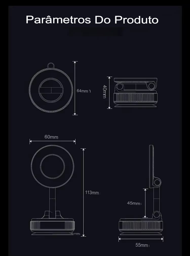 Suporte Magnético 360° com ventosa. Seguro e ajustável para diversas superfícies. Praticidade e inovação.