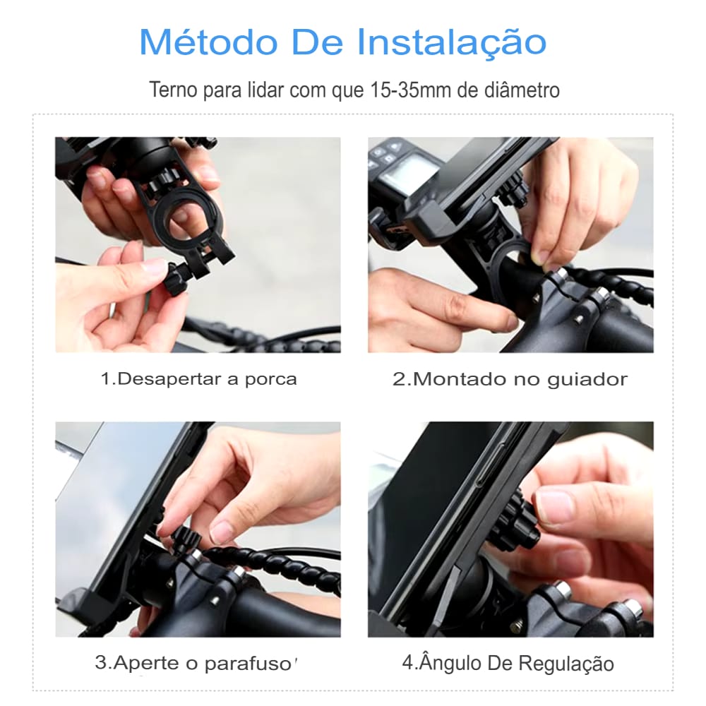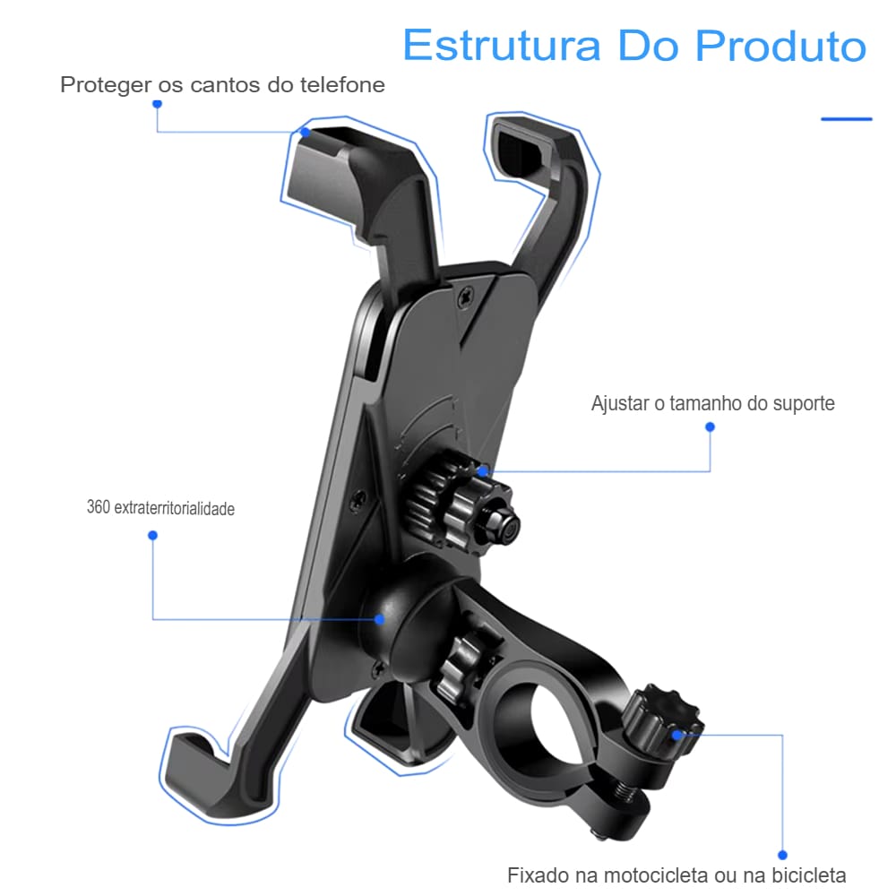 Suporte universal para celular em bicicletas e motos. Fácil instalação, compatível com vários modelos.