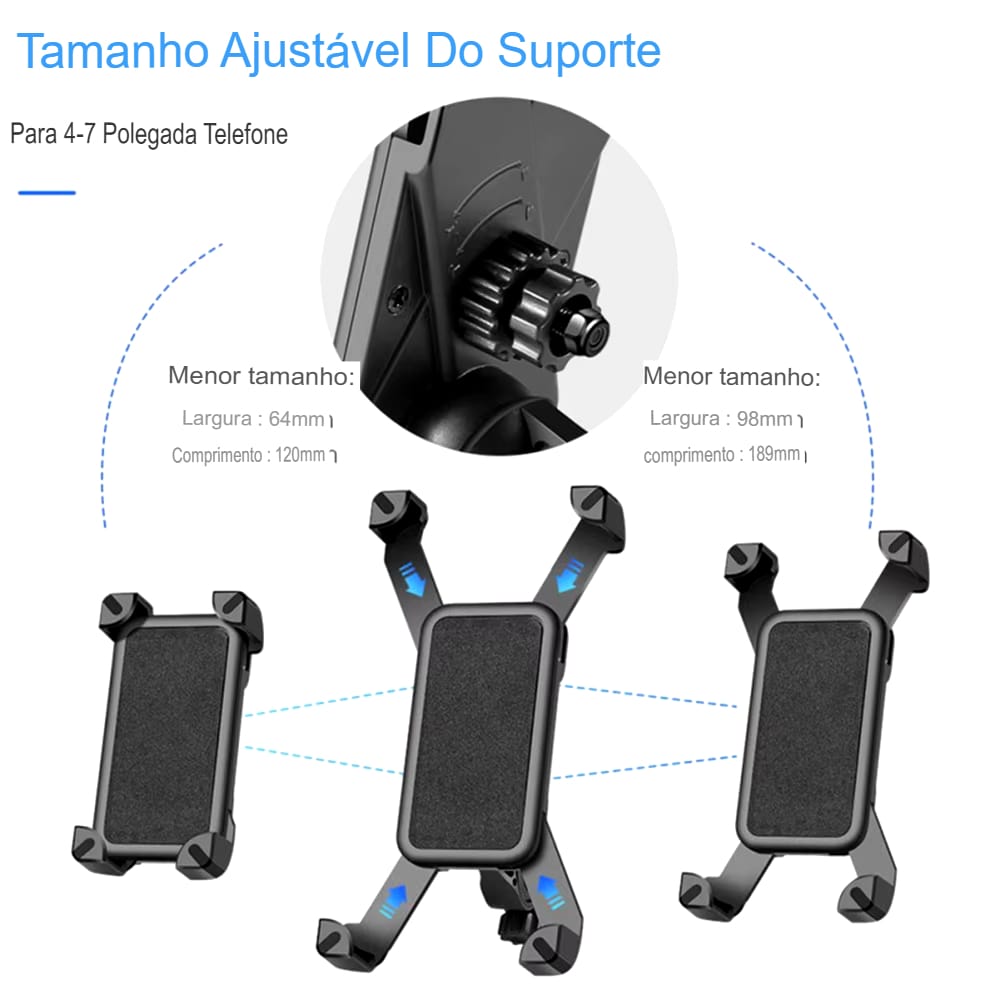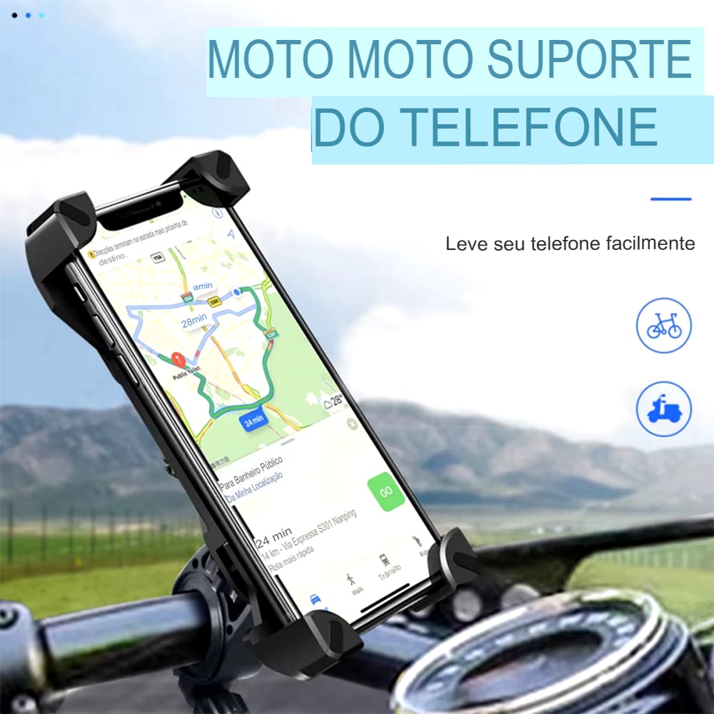 Este suporte é fácil de instalar no guidão da sua bicicleta ou moto, garantindo que seu smartphone fique firme durante todo o trajeto. Compatível com celulares de 4 a 6.5 polegadas, ele se adapta a diferentes modelos, como iPhone e Samsung, trazendo versatilidade ao seu dia a dia.