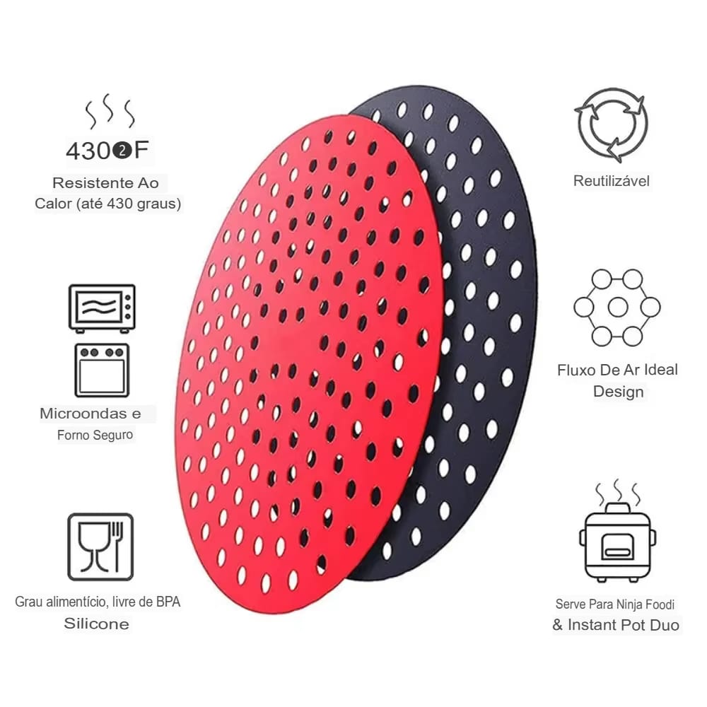 Tapetes reutilizáveis de silicone não aderente para air fryer. Melhore suas receitas com menos bagunça.