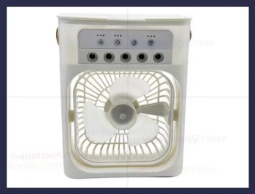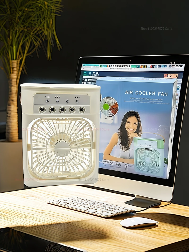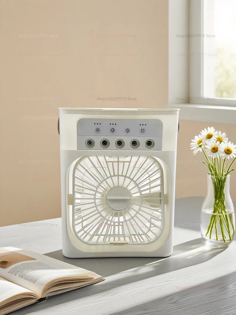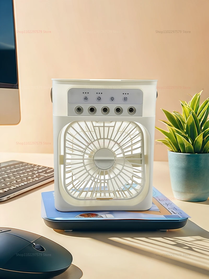 Ventilador portátil 3 em 1 com umidificador e luz LED. Ideal para casa e viagens.